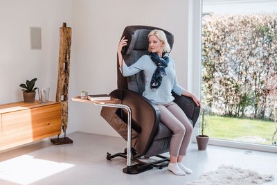 Und nach der Dusche gemütlich im Sessel sitzen, ein Buch lesen und einen Tee schlürfen: Der „Club 2“ ist ein Sitzmöbel, das perfekt auf die Bedürfnisse vom Menschen zugeschnitten ist, die sich aus eigener Kraft nicht gut bewegen können. Der Relaxsessel lässt sich elektrisch über eine Fernbedienung in Liegeposition bringen, die ein kleines Schläfchen erlaubt, und andersrum so weit aufrichten, dass der Nutzer sanft in den Stand gehoben wird. Die optimale Sitz- und Liegeposition wird per Fußpedal eingestellt.