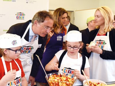 Gestartet wurde die Initiative kürzlich in der Schweriner Astrid-Lindgren-Schule. Nicht nur die Fernsehköchin selbst war zum Auftakt dabei, sondern auch Bundesfamilienministerin Manuela Schwesig und Dr. Christoph Straub, Vorstandsvorsitzender der Barmer GEK. Gemeinsam mit Viertklässlern bereiteten sie unter anderem ein Möhren-Schaumsüppchen und einen Obstsalat zu.