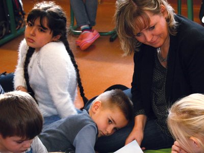 AOK-Niederlassungsleiterin Katrin Stancák und ihre Mitarbeiterinnen Astrid Eichler und Stefanie Golla kürzlich in der John-Brinckmann-Schule zum Vorlesetag Geschichten.
