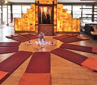 Leise plätschert das salzige Wasser den Reisig hinunter und verleiht dem Raum eine gesunde Atemluft. Das warme gedämpfte Licht, das durch die Salzsteine schimmert, bietet eine gemütliche Atmosphäre, so dass ein Wohlfühlen leichtfällt. Ein aromatischer Duft liegt in der Luft. Das Kerzenflackern beruhigt die Sinne.