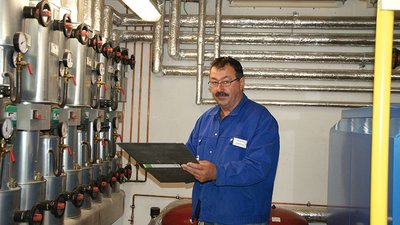 Der Rasen, der gemäht werden will, das Fenster, was nicht richtig schließt, der Rollstuhl, an dem eine Schraube locker ist – abgesehen von den medizinischen Apparaten sind die Männer tatsächlich für alles zuständig. Imposant sind vor allem die großen Lüftungs-, Klima- und Heizungsanlagen, die auf allen Stationen, in den OP-Sälen, im Empfangsbereich der Klinik und im Küchenhaus beständig für gute Luft und angenehme Temperaturen sorgen. Luft im bedeutendsten Sinne des Wortes liefern auch die 50-Liter-Gasflaschen, auf deren Verbrauch die Techniker genaustens achten: Von hier aus wird lebenswichtiger Sauerstoff zur Beatmung in den OP-Bereich und die Patientenzimmer geleitet. Kompressoren wiederum erzeugen Druckluft oder ein Vakuum, die ebenfalls bei Operationen eingesetzt werden. Für den Notfall ist ein großes Notstrom-Aggregat verfügbar. Genau wie dieses wartet das signalgelbe Rad im Fahrstuhl-Maschinenraum hoffentlich vergeblich auf seinen Einsatz: Hier können Fahrstühle im Fall der Fälle per Hand bewegt werden. Allmorgendlich werden diese und alle weiteren technischen Einrichtungen von Rainer Schulz und seinen Kollegen in Augenschein genommen. Für jedes Gerät sind Prüf-Intervalle gesetzlich vorgegeben, auf dem Rundgang werden alle nötigen Werte abgelesen. Und neben der Wartung und Prüfung der Anlagen gibt es etliche weitere Zuständigkeitsbereiche, die auf den ersten Blick gar nicht auffallen. Da wäre zum Beispiel die Schädlingsbekämpfung, die die Haustechniker vorbeugend vierteljährlich mit dem Kammerjäger durchführen müssen. Aber genau das ist es wohl, was ein gutes „Mädchen für alles“ auszeichnet: Niemand bemerkt seine Arbeit, eben weil alles in bester Ordnung ist.