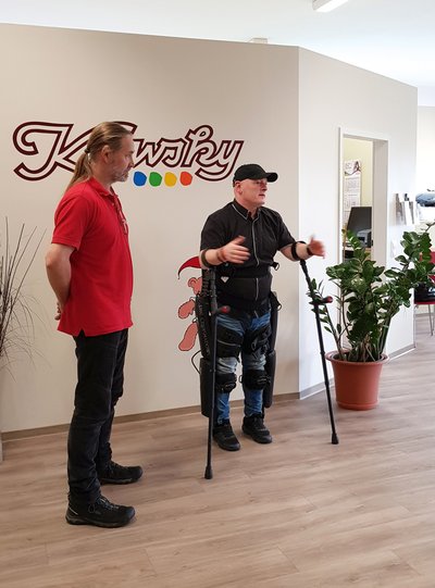 Schließlich wollte er Orthopädietechnikmeister Torsten Lindig, der sich um ihn und das Exoskelett kümmert, zeigen, wie gut es mit dem Aufstehen, Hinsetzen, Gehen und Richtung wechseln klappt. Sogar das Treppensteigen ermöglicht das Gerät. Seine Tochter wohnt im fünften Stock; ohne Fahrstuhl, und bis dort hinauf hat er es schon geschafft!