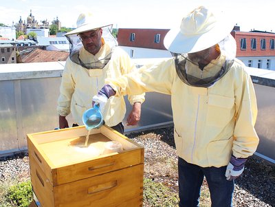 Und tatsächlich: Das Volk ist wieder gewachsen: Als das Bienendomizil vor rund sechs Wochen auf dem Schlosspark-Center errichtet wurde, sei das Volk nur ungefähr ein Drittel so groß wie jetzt gewesen, schätzt der Imker. Sein Blick auf die Rähmchen, die er bei unserem Besuch auf dem Dach nach und nach begutachtet hatte, verriet ihm: Eine neue Generation des Bienenvolkes wächst heran. Pollen in den Waben entdeckte er ebenso wie Jungbienen.