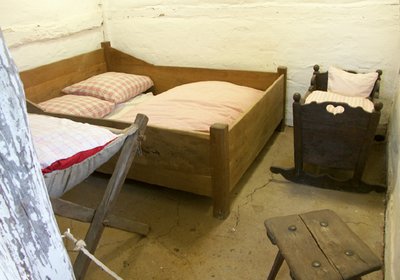 An der Rückseite der Diele sind heute zwei Kochstellen rekonstruiert, an denen früher die beiden Hausfrauen - Rücken an Rücken - das Essen zubereiteten. „Bei dieser Enge kann ich mir schon vorstellen, dass auch mal die Kochlöffel flogen“, sagt Volker Janke. Er kennt sogar Überlieferungen, die von weißen Strichen erzählen, welche in Häusern gezogen wurden, um die eigene Fläche von der fremden abzugrenzen. Die räumliche Enge war der Sparsamkeit geschuldet. Hirten, die oft nur für eine Saison angestellt waren, gehörten zum untersten bäuerlichen Stand. „Deshalb spielte das Wort ,wohnen‘ in einem Haus wie diesem keine Rolle, es wurde entweder gearbeitet oder geschlafen“, erklärt Janke. Auch die Raumtemperatur machte den Hirtenkaten im Winter nicht unbedingt anheimelnd: Auf der Diele mit ihren beiden Feuerstellen war es ungefähr fünf Grad wärmer als draußen. „Quellen erzählen, dass in kalten Wintern auf den Bettdecken eine Eisschicht lag“, schmunzelt Volker Janke. Kirschkernkissen und am Feuer gewärmte Feldsteine waren das Rezept der Menschen gegen die Kälte.