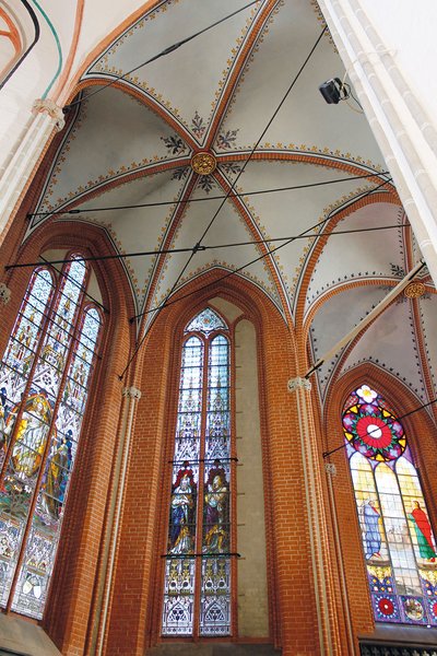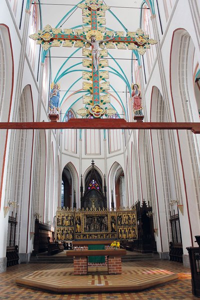 Die meisten Besucher betreten den Dom durch das Marktportal. Manchmal ist aber auch das Hauptportal geöffnet, durch das die Eintretenden durch das Langhaus auf Altar und Chor zuschreiten. „Anfang Mai gibt es Tage, an denen die Sonne frühmorgens genau auf die Rosette hinter dem Altar fällt und den ganzen Dom in Farbe taucht. Unser Küster sagt, dass es sich allein für diese Tage lohnt, hier zu arbeiten“, erzählt Albrecht Martins. Die wunderbaren Glasfenster gehören zu den Schätzen, die der Dom birgt. Das gilt besonders für das Fenster, das der Berliner Hofmaler Peter von Cornelius für die Heilig-Blutskapelle entwarf, die der junge Großherzog Friedrich Franz II. nach dem Tod seines Vaters Paul Friedrich zur Begräbnisstätte des Großherzoglichen Hauses bestimmte. In einer anderen Gruft unter einer Seitenkapelle ruht Johann Albrecht I., Bauherr der Schlosskirche und als fortschrittlicher Renaissancefürst Förderer von Kunst, Kultur und Bildung. Zu den wertvollsten Grabplatten des Doms gehören die vierer Bischöfe der Familie von Bülow. Die gravierten Messingplatten hängen an der nördlichen Querhauswand und zeigen je zwei liegende Gestalten in vollem Ornat. Wer dicht davor steht, entdeckt zusätzlich einen ganzen Kosmos von Figuren: zottlige Wesen, die Jungfrauen rauben, Löwen und Fabeltiere. Einen Bilderreigen offenbart auch der Loste-Altar, den Bischof Conrad Loste 1495 stiftete. Und selbst wenn viele Ausstattungsstücke im Laufe der Jahrhunderte verschwunden sind, bewahrt Schwerins größte Kirche viele Spuren der Stadtgeschichte. Genauso, wie hier Geschichte geschrieben wurde: Gerlinde Haker kann sich noch gut erinnern, wie die Menschen hier 1989 zu den Friedensgebeten drängten. Tausende nahm der Dom damals auf, viele weitere standen draußen auf dem Markt. Dass der Dom als Wahrzeichen jahrhundertelanger Historie weithin sichtbar ist, verdankt das Bauwerk übrigens dem Grafen Arthur von Bernstorff. Dieser, so wird erzählt, wollte auch von seinem Stammsitz im 30 Kilometer entfernten Wedendorf den Schweriner Kirchturm sehen.