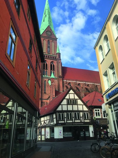 Eigentlich müsste an dieser Kreuzung der Schloßstraße ein Pfeil auf dem Pflaster sein. Einer mit der Aufschrift: Postkarte hier. Der Blick durch die Buschstraße auf den Dom und das einstige Kunstgewerbehaus im Vor- dergrund gehört zu den schönsten Fo- tomotiven, die die Stadt zu bieten hat. Gleichzeitig steht das Gebäudeensem- ble für ein altes Stück Schwerin. Zwar kann es das kleine spitzbedachte Fach- werkhäuschen nicht mit den Jahren des Doms aufnehmen, aber in seinem Kern reicht es vermutlich bis ins 17. Jahrhundert zurück.