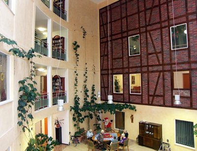Herzstück des innerstädtischen Komplexes ist ein mit Glas überdachter Lichthof, um den sich mehrere Neubauten gruppieren. Eine Wand besteht allerdings aus Fachwerk: Es ist die Außenwand des Baudenkmals „Casino“ mit dem historischen Saal. „Sie musste jedoch neu aufgemauert werden, da die alte Substanz sehr marode war“, erklärt Petra Rassau. Auch im Saal gab es einige Veränderungen: So wurde der gesamte Raum „tiefer gelegt“, da sich im Zuge des Umbaus die Etagenstruktur veränderte.