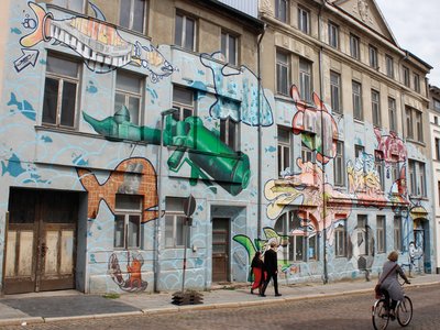 Anlässlich der Bundesgartenschau im Jahr 2009 gestaltete der Schweriner Künstler Tino Bittner zusammen mit „Ataraxia“-Schülern die graue Fassade mit bunten Graffiti. S. Krieg