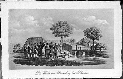 1651 ließ der Heubinder Max Bahr an der Furt durch die Püsserbeke einen Katen errichten. Bahr hatte sein Hab und Gut beim großen Stadtbrand im gleichen Jahr verloren und zog nun weit hinaus vor die Tore der Schwerins. Fuhrwerke, die von Süden und Osten kamen, nahmen den Weg durch die Furt und so wurden im Bahrenkaten, wie das Haus nach seinem Besitzer genannt wurde, Erfrischungen ausgeschenkt. So entstand ein Gasthaus von teils zweifelhaftem Ruf, das zeitweise mehr für Raufereien als die Qualität von Speisen und Getränken berühmt wurde. Nach dem Ende der Schweriner Cholera-Epidemie von 1831 witzelte man sogar, der schlechte Branntwein im Püsser Krug habe die Krankheit abgeschreckt. Fest steht jedoch, dass auch zu diesem Zeitpunkt – in der ersten Hälfte des 19. Jahrhunderts – das Gasthaus fast allein auf weiter Flur stand. Eine Arbeit von Hofzeichner August Achilles aus dem Jahr 1831 zeigt die Cholera-Wache an der Furt, im Hintergrund den Püsser Krug und im Vordergrund eine Schutzhütte für die Wächter.