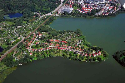 In Schwerin baut man am Wasser. So ist es allgemein und auf dem Dwang in besonderer Weise. Die kleine Halbinsel ist von drei Seiten vom Ostorfer See umgeben. Auf alten Karten wird sie deutlich größer dargestellt – kein Wunder, machte doch die Eisenbahnlinie Mitte des 19. Jahrhunderts einen Strich durch die Landschaft.