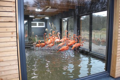 Der Raum für die Flamingos ist in Anthrazit gehalten, weil vor diesem Hintergrund die Tiere am besten zur Geltung kommen. Durch die großen Fenster dringt viel Tageslicht in das Haus, die Besucher können die Flamingos gut beobachten – und andersrum: Die scheuen Vögel sehen die Leute frühzeitig kommen und erschrecken nicht, wenn plötzlich jemand an der Glasscheibe vor ihnen steht.