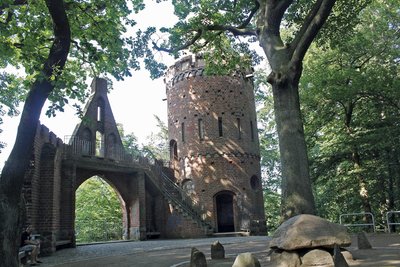 Der Weg schlängelt sich in der Nähe des Ufers durch den Wald. Immer wieder schimmert das Blau des Schweriner Sees durchs Blätterdach. Dann öffnet sich der Pfad zu einem runden Platz, auf dem eine Burgruine mit Bergfried und Torbogen wacht – wie die Kulisse für ein romantisches Gemälde. Doch bevor es zu kitschig wird, stopp: Denn das beschädigte Mauerwerk stammt aus dem Skizzenbuch des Schweriner Architekten Gustav Hamann und wurde im Auftrag der Gemeinnützigen Gesellschaft 1907 errichtet. Anlass war der Tod des Herzogs Friedrich Wilhelm, eines Sohns Friedrich Franz II. aus dritter Ehe, der 1897 als Kommandeur eines Torpedobootes auf der Nordsee verunglückt war. Den Namen des jungen Herzogs trug der Platz auf der Landspitze, die ein beliebtes Ausflugsziel der Schweriner war, zu diesem Zeitpunkt schon seit mehr als 20 Jahren. 1899 war hier ein 50 Zentner schwerer Findling zum Gedenken an Friedrich Wilhelm aufgestellt worden, nun kam das Bauwerk im neoromantischen und neogotischen Stil hinzu – „eine unvollendete Burg für ein unvollendetes Leben“.