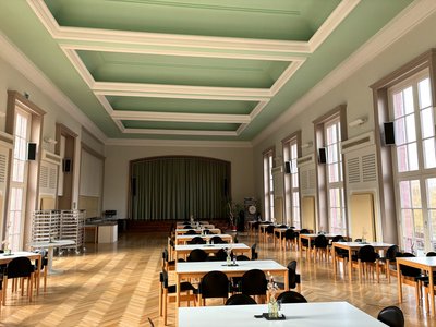 Ausgebildet werden Ingenieurpädagogen, größtenteils für den Bereich Landwirtschaft, und Erzieher. Der Bezug zur Landwirtschaft wird schon vor dem Haus sichtbar. Da steht Thomas Müntzer – zumindest als Büste. Der Theologe des Reformationszeitalters war in der DDR als Revolutionär und Bauernführer in der Erinnerungskultur präsent. Ein Fresko „Müntzer spricht zu den revolutionären Bauern“ ist auch heute noch im Erdgeschoss zu finden. „Eine ehemalige Studentin erzählte bei einem Tag der offenen Tür, dass das Institut auch den Namen ,Thomas Müntzer‘ trug und dieser Name in Einzelbuchstaben über dem Eingang stand. Belegt ist das allerdings nicht“, sagt Claus Tantzen. Er ist Pressesprecher im Landwirtschaftsministerium oder wie es amtlich heißt: im Ministerium für Klimaschutz, Landwirtschaft, ländliche Räume und Umwelt. Das Ministerium hatte das einstige Schulhaus 1991 übernommen. Noch keine 100 Jahre alt, steht das Haus bereits unter Denkmalschutz. Bereits im Foyer macht Claus Tantzen auf den Deckenleuchter aufmerksam, der zur Originalausstattung der 1950er Jahre gehört. „Ableger“ dieses Leuchters sind als Wandlampen an der Wand der einstigen Aula zu sehen, auf deren Bühne zu Zeiten der DDR auch Jugendweihen stattfanden. Heute ist hier unter schönster Stuckdecke die Kantine des Ministeriums.