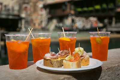 Wie zu allem gibt es auch dazu eine Geschichte: Darin heißt es, dass Weinhändler in der Mitte des 19. Jahrhunderts auf dem Markusplatz Wein im Schatten des Campanile, des Glockenturms, ausgeschenkt hätten. Und weil es sich im Kühlen nunmal besser trinkt, sei die mobile Weinbar mit dem Schatten des Campanile über die Piazza gewandert. Ob das nun stimmt – wer weiß. Fest steht, dass in Venedig die Bezeichnung „ombra con cicchetto“ der Wegweiser zu einem Gläschen Wein mit einem Häppchen ist –analog zu den spanischen Tapas. Gläschen stimmt übrigens aufs Wort: Beim Ombra ist kein Schoppen im Glas, sondern wirklich nur ein 0,1-Liter-Füllung. Korrekterweise müsste es sogar die Ombra heißen – das Wort für „Schatten“ ist in der italienischen Sprache weiblich.