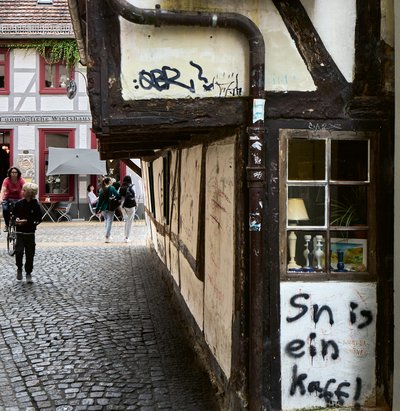 Vielmehr geht es um den anderen, den besonderen Blick. An einem der ältesten Fachwerkhäuser Schwerins in der Engen Gasse steht an die Wand gesprayt zu lesen: „Sn is ein Kaff!“ Der Widerspruch ließ nicht lange auf sich warten und ein echter Patriot schrieb mit rotem Stift und an passender Stelle ein „wunderschönes“ hinzu. Nun steht