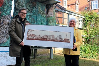 Den Wunsch nach einem großformatigen Aquarell lehnte die Laienkünstlerin ab, schlug aber einen Linoldruck vor. Dargestellt werden sollten markante Gebäude der alten und neuen Wohnquartiere. Da die Tallinner Amtskollegen während ihres Besuchs in Schwerin offenbar das Weinhaus Wöhler in guter Erinnerung behalten hatten, wünschten die Auftraggeber, dass es ebenfalls abgebildet werden sollte Papier organisierte Elfriede Kostka von der Druckerei der Schweriner Volkszeitung. Da ihr keine entsprechend große Druckpresse zur Verfügung stand, war Handarbeit gefragt. „Dafür wurde nach Präparieren der Druckplatte das Papier darauf Stück für Stück mit gleichmäßigem Aufdrücken eines Silberlöffels abgerieben,“ erinnert sie sich. Vier Drucke entstanden auf diese Weise. Einer wurde nach Tallinn verschenkt, zwei blieben beim Rat der Stadt. Sie sind nicht mehr erhalten. Ein viertes Exemplar bewahrte die Künstlerin als Erinnerung auf und übergab es jetzt an den Leiter des Kulturbüros Dirk Kretzschmar – als „interessantes kulturgeschichtliches Zeugnis der Stadtgeschichte“, wie dieser betonte.