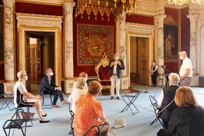 Mit den seitlichen Vorhangschals, die bereits Architekt Friedrich Stüler in einer kolorierten Entwurfszeichnung festhielt, ist das Raumkunstwerk nun wieder komplett. Die Draperien waren im Gegensatz zu den Schabracken nicht mehr erhalten, sondern mussten neu angefertigt werden. Besonders die stellvertretende Vorsitzende des Schlossvereins, Dr. Irmela Grempler, trieb das Projekt immer wieder voran – und spendete zusammen mit ihrem Mann Gerd selbst für einen der Schals. In einen weiteren sind die Namen des Vereinsvorsitzenden Mathias Schott und seiner vor zwei Jahren verstorbenen Mutter Marianne eingestickt.