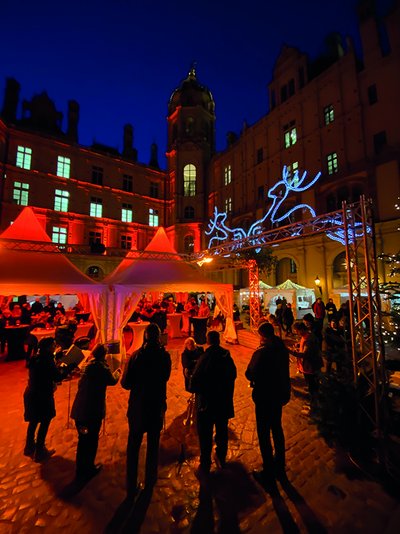 Wenn der große Herrnhuter Stern über dem Zugang zum Schlossinnenhof leuchtet, ist es Zeit für die Höfische Weihnacht. Vom 13. bis 22. Dezember locken hier zauberhafte Adventstage. Und wie in den vergangenen Jahren soll auch diesmal Kunst auf Atmosphäre treffen – verbunden mit der Gelegenheit, gut zu essen und zu trinken.