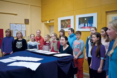 Mehr als 20 Kinder und Jugendliche im Alter von 11 bis 16 Jahren vom Kinder- und Spatzenchor des Goethe-Gymnasiums trafen sich im Dezember bereits zu einer ersten Probe für „Sonnenallee – Das Musical“ im Chorsaal des Staatstheaters. Sie werden in dem Musical ab