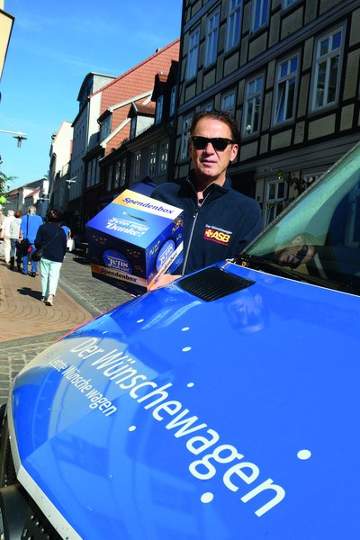 Zudem fand ein Flohmarkt statt, und es wurden Imbiss und Getränke verkauft. Die Veranstalter des Festes – die Händler der Münzstraße und der 1. Mecklenburger Uhrenclub – spenden alle Einnahmen dem Projekt „Wünschewagen“, das von Jens Kulbatzki (u.) vorgestellt wurde.
