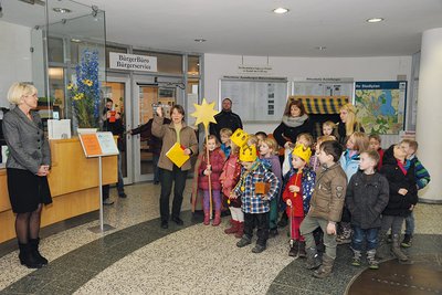 Die kleinen Sternsinger der Kindertagesstätte der Katholischen Gemeinde St. Anna besuchten am 9. Januar das Stadthaus. Nach altem Brauch überbrachten sie den Segen Gottes und die friedensbringende Botschaft von Bethlehem. Begrüßt wurden sie von Oberbürgermeisterin Angelika Gramkow, bevor sie ihr kleines Programm mit Liedern und Gedichten aufführten und um Spenden für die armen Kinder der Welt baten, in diesem Jahr insbesondere für Flüchtlingskinder. An die Haustür schrieben sie mit Kreide die traditionelle Segensbitte „20*C+M+B+14“. Das diesjährige Leitwort lautet „Segen bringen, Segen sein. Hoffnung für Flüchtlingskinder in Malawi und weltweit!“. Seit mehr als 50 Jahren ziehen Kinder als Sternsinger alljährlich im Januar von Tür zu Tür und sammeln für Kinder in Not.