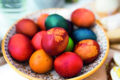 Eier – als Symbol des Lebens – dürfen im Osterstrauß nicht fehlen. Eine schöne Methode ist das Färben der Eier mit natürlichen Farben und das Verzieren mit Blüten, Blättern und Gräsern.