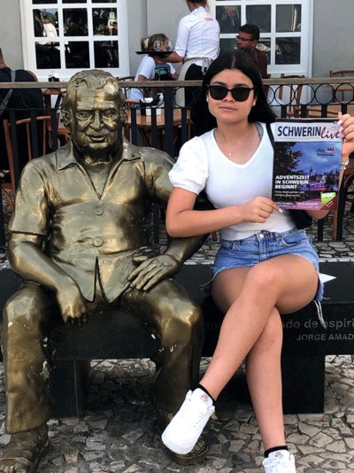 Die Brasilianerin Maria Clara ist vor zwei Jahren mit ihrer Familie nach Norddeutschland gezogen. Den Weihnachtsurlaub verbrachte sie bei ihrer Großmutter in der alten Heimat. Als Reiselektüre hatte sie sich unter anderem eine Ausgabe des Stadtmagazins „Schwerin live“ mitgenommen. Das Foto entstand vor der Bar „Vesúvio“ in der Stadt Ilhéus (Bundesstaat Bahia). Neben ihr eine Skulptur des Schriftstellers Jorge Amado.