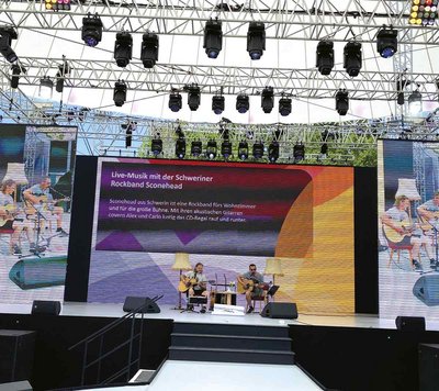 Die Schweriner Band Sconehead hat die Präsentation von Mecklenburg-Vorpommern anlässlich des Demokratiefestes „75 Jahre Grundgesetz“ in Berlin gerockt. Oft wollten die Zuhörer den beiden Gitarristen am MV-Zelt gar keine Pause gönnen, so laut waren die Rufe nach Zugaben. Und schließlich durften Alex und Carlo für eine dreiviertel Stunde sogar auf die große 360-Grad-Bühne zwischen Kanzleramt und Reichstag.