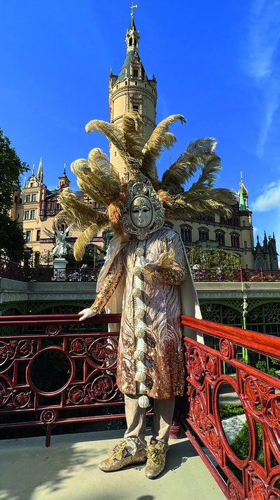 „Mein Herz hört man wahrscheinlich bis da hinten klopfen. Das ist das, was ich mir immer erträumt habe.“ Mit diesen Worten begrüßte Reimond Weding als Organisator und Ideengeber für die Venezianischen Tage Maskenträger und Besucher auf dem Schweriner Markt. Und der war voller Menschen: Sie alle wollten zusehen, wie ein Hauch von Carnevale aus dem mecklenburgischen Schwerin ein „Venedig des Nordens“ machte. Mehr als 200 Masken- und Kostümträger und etliche Fotografen waren der Einladung Wedings gefolgt. Sie kamen aus Venedig und Wien, München, Nürnberg und Bonn, Belgien, Großbritannien und Polen. Die wohl weiteste Anreise hatte die Fotografin Irene Wung aus Hongkong.