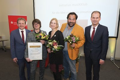 Der Kunst- und Kulturpreis 2022 geht an das Jugendsinfonieorchester Schwerin, Manuela Kolditz-Hermelschmidt, die Initiative musiKKlub und Steffi Küchenmeister. Verliehen wird er von der Stiftung der Sparkasse Mecklenburg-Schwerin in Kooperation mit der Landeshauptstadt. In der historischen Kundenhalle der Sparkasse in der Wismarschen Straße betonte Oberbürgermeister Rico Badenschier bei der Ehrung die Vielfalt der kulturellen Landschaft Schwerins. Gerade in der Corona-Zeit hätten viele Künstler kreative Ideen entwickelt, um weiter ihr Publikum zu finden, so Badenschier: „Der Kunst- und Kulturpreis 2022 signalisiert in dieser Situation, dass die Akteure und Schöpfer künstlerischer und kultureller Leistungen für Schwerin unverzichtbar sind.“ Das zeigt zum Beispiel die Auszeichnung für kulturelle (Wieder-)Belebung, die an die Initiative musiKKlub geht. Die Initiatoren sind der Musiker Carsten Stotco und der Schauspieler Martin Neuhaus in Kooperation mit Gerit Kühl, Leiterin der Schweriner Musik- und Kunstschule ATARAXIA. Mit ihrer Idee haben sie Künstlern in einer schwierigen Zeit eine Bühne geboten. Gleichzeitig war der Dienstagabend auf dem Marktplatz über Monate ein fester Termin für viele Schweriner. Der musiKKlub verwandelte einen um diese Zeit relativ leeren Platz zum beliebten Treffpunkt für Einheimische und Touristen.