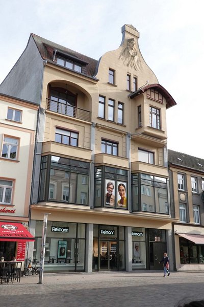 Doch zurück zu Johannes Voß, der 1904 das Geschäftshaus mit seiner Damenmäntel-Fabrik, „Mantel-Voß“ bezog. Das Gebäude lockte mit einer aufwendigen Verglasung der Ladenflächen im ersten und zweiten Obergeschoss. Allerdings wurden hier nur wenige Jahre Mäntel verkauft, dann erwarb Kaufmann Lohmann das Haus. Auch das angebotene Sortiment wechselte in der Folgezeit immer wieder. Ein Buttergeschäft, ein Zigarrenladen und eine Versicherung zogen ein. Auch das Aussehen des Hauses änderte sich in dieser Zeit. War die Fassade anfangs durch drei Ladengeschosse mit großen Glasfenstern und Putzdekor sehr opulent, wurde sie nach einem Umbau 1928 deutlich schlichter. Das Relief im Giebel, Erker und Loggia sind aber noch heute zu sehen.