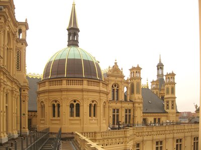 Auch mit anderen Vorstellungen muss sie aufräumen: Zum Beispiel mit der, dass das Schloss so viele Türme hat wie es Tage im Jahr gibt. „Nein, 365 sind es nicht. Sondern 15 Türme, 100 Spitzen und 25 Schornsteine“, erklärt die Schlossführerin. Die vielen Spitzen, die dem Gebäude das Aussehen eines Märchenschlosses geben, entstanden beim großen Schlossumbau im 19. Jahrhundert. Der in die Jahre gekommene Regierungssitz der Mecklenburger Herzöge, den die Herrscher zwischenzeitlich sogar zugunsten eines Neubaus in Ludwigslust aufgegeben hatten, wurde zwischen 1843 und 1857 dem Zeitgeist entsprechend saniert. Hofbaurat Demmler, der anfangs mit seinen Entwürfen bei Großherzog Friedrich Franz II. nicht punkten konnte, begab sich auf eine Dienstreise nach England und Frankreich und kehrte inspiriert vom Loireschloss Chambord zurück. Auch andere namhafte Architekten nahmen an der „Ausschreibung“ zum Schlossumbau teil, darunter Gottfried Semper, dessen Entwürfe in den Hauptturm, den so genannten Semperturm, einflossen. „Semper wollte aber die alten, vorhandenen Bauteile nicht integrieren. Außerdem waren seine Entwürfe zu schwer für den fragilen Untergrund der Schlossinsel“, erklärt Anette Schwarz. Der 70 Meter hohe Hauptturm zum Beispiel wiegt 3000 Tonnen.
