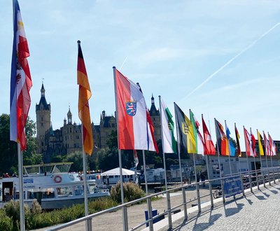 Besucher aus ganz Deutschland werden zum Tag der Deutschen Einheit erwartet. Zur Begrüßung wehen am Anleger der Weißen Flotte die Flaggen aller 16 Bundesländer. Dahinter lockt das Flottenfest mit Ausfahrten auf dem Schweriner See und Aktionen am Anleger.