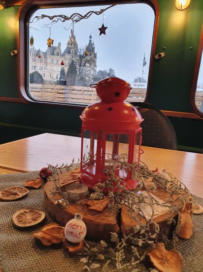 Apropos Glühschiff: Auf Wunsch verwandelt sich die MS „Lübz“ auch in eine Location fürs gemütliche Beisammensein. Hier gilt die 2G-Plus-Regel - und auch von den Tischen im Schiffsbauch gibt es einen wunderbaren Blick aufs Schweriner Schloss.