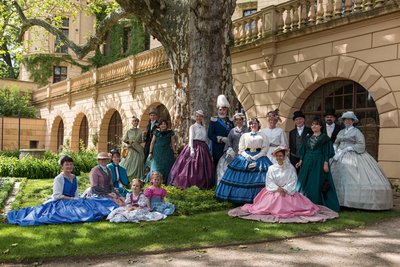 Zuvor flanieren gewandete Mitglieder des Schlossvereins im Burggarten und versetzen ihn ebenso wie seine Besucher in die Zeit um 1850. Vor und nach dem Konzert lässt es sich gut bei einem Kaffee oder Snack in der Orangerie verweilen.
