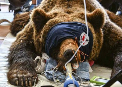 Dieses Mal stand Mascha auf dem Behandlungsplan. Sie ist bereits 30 Jahre alt. Damit ist die Bärin eine „alte Dame“: In freier Wildbahn leben Bären rund 20 Jahre. Bei guten Bedingungen wie großen Gehegen mit Wasser und Wald, bei artgemäßer Fütterung und medizinischer Versorgung können Bären auch 30 und mehr Jahre alt werden.