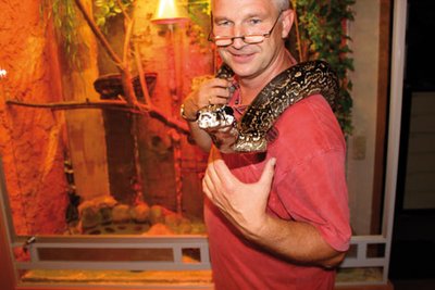 Bei Bodo Schäfer tummeln sich in mehr als 100.000 Liter Teich- und Aquarienwasser etwa 500 Arten. Da sollte es doch möglich sein, einen Fisch zu finden, dem die eigenen räumlichen Verhältnisse angemessen sind. Die gläsernen Behausungen in Dr. Siegfried Mildners Keller zum Beispiel würden sehr, sehr vielen Fischen Platz bieten – wären sie nicht Terrarien. Hier leben acht Boa constrictor imperialis und -occidentalis. Erstaunlich weich sind sie und friedlich. Als sogenannte Lauerjäger verbringen sie die meiste Zeit mit dem Warten auf eine günstige Gelegenheit. Beim Beobachten des langsamen Schlangenlebens im tropisch temperierten Untergeschoss seines Hauses findet der Allgemeinmediziner nach einem hektischen Tag seinen Ausgleich. Die dämmerungsaktiven Tiere haben in der Hobby-Zucht seit Ende der 1990er-Jahre bereits 247 Nachkommen zur Welt gebracht. Die aktuelle Schlangenmutter Bea (Foto) wiegt 20 kg bei einer Länge von 2,30 m. „Ausgewachsen sind die Tiere aber nie“, weiß Mildner. Mit einer Mahlzeit kommen sie Wochen über die Runden, was dem Besitzer relativ viel Freiheit lässt. „Dafür werden sie aber mehrere Jahrzehnte alt“, fügt er hinzu. Eine seiner Töchter habe einmal angemerkt, die Tiere müssten später mit ins Altersheim ziehen. Und dann sind da ja noch die Karpfen und der Hecht aus dem Gartenteich – und die