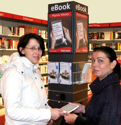 Anfang des Monats startete die Buchhandlung Weiland am Marienplatz als erste stationäre Buchhandlung der Stadt eine eBook-Offensive. An einem von überregionalen Ladenbau- Architekten eigens entwickelten Verkaufsmöbel mit integrierter Vorführstation haben Kunden die Möglichkeit, unterschiedliche Reader selbst in die Hand zu nehmen und auszuprobieren. Darüber hinaus kann man sich online unter www.weiland. de über 30.000 eBooks herunterladen. „Wir freuen uns, unseren Gästen nun im ersten Zug gleich vier verschiedene eBook-Reader vorführen und präsentieren zu können“, so Karin Dettmers, Buchhändlerin mit einer ganz frischen Spezialausbildung zum Thema. Neben den Marktführern von Sony werden das die Geräte iRiver Story und der Bookeen Opus sein.