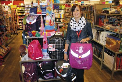 Viel zu besorgen also für die Eltern.Und damit viele Wege zu laufen? Nein, denn im Kaufhaus Stolz findet sich alles kompakt und in großer Auswahl. Die Fachverkäuferin Alexandra Paris, die die dortige Schreibwarenabteilung leitet, weist auf das vielfältige Sortiment an Schultaschen hin: „Wir bieten Produkte von Herlitz an. Das geht vom Mini-Softbag für Vorschulkinder über Erstklässler-Ranzen bis hin zu Rucksäcken für ältere Schüler.“ Alle diese Modelle gibt es in unterschiedlichen Farben und Designs.