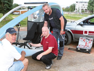 Bei dem ständigen Einsatz der Fahrzeuge über Monate ist es wichtig, dass sich die Pfl ege und Wartung der Fahrzeuge in kompetenter Hand befi nden. „Mit dem Dienstleistungs-Zentrum Schwerin von Jens Suhr haben wir einen sehr guten Partner an unserer Seite, wenn die Defekthexe zuschlägt”, berichtet Velo-Taxi-Geschäftsführer Steffen Kusebauch. „Bereits lange vor Eröffnung der Bundesgartenschau half die Firma uns bei allen technischen Fragen.” So mussten die Fahrzeuge, die gebraucht aus Berlin angeliefert wurden, einem gründlichen Erstcheck unterzogen werden.