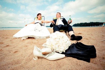 E.R.: Viele Menschen verkrampfen sehr schnell, wenn ein Fotoapparat in der Nähe ist. Dadurch wirken die Bilder manchmal ein wenig steif. In der Regel entspannen sie sich nach dem Foto, lachen vielleicht. Und dann machen wir das entscheidende Bild. Wenn die Stimmung gelöst ist. Außerdem verbindet viele Paare ein gemeinsames Hobby. Wenn wir das wissen, können wir uns darauf einstellen. Das gibt manchmal verrückte Bilder.