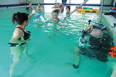 Ritual“, sagt sie und blickt auf ihren einjährigen Sohn Tico. Der heißt wie der Orca aus einer Fernsehserie und hat vor Wasser – wie sein Namensgeber – keine Angst. Kursleiterin Uschi Krause von der AWO Soziale Dienste gGmbh begleitet seit ein paar Wochen die jungen Eltern und ihren Nachwuchs bei den Schwimmstunden. „Bei ganz kleinen Kindern besteht ein natürlicher Tauchreflex. Den versuchen wir möglichst lange aufrecht zu erhalten. Erst wenn sich die Kinder an das nasse Element gewöhnt haben und es mögen, laden wir die Kursteilnehmer zum Fototermin ein“, betont die Kursleiterin.