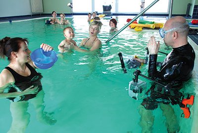 An dieser Stelle kommt Henrik Eilers ins Spiel. Der 48-jährige Schweriner fotografiert seit drei Jahren vom Beckenrand Kinder und ihre Eltern beim spielerischen Treiben. Höhepunkt jedes Fototermins sind allerdings die Aufnahmen unter Wasser. Für die steigt Henrik Eilers mit seiner wassergeschützten Canon EOS in das mollig warme Bad und schiebt seine Taucherbrille zurecht. Kursleiterin Uschi Krause bereitet das zu fotografierende Kind mit kleinen Wassergüssen auf den Tauchgang vor. Danach geht alles blitzschnell. Für einen kurzen Moment nur tauchen Kind und Fotograf unter die Wasseroberfläche. Erleichterung auf beiden Seiten, wenn die Eltern ihren Schützling wohlbehalten wieder im Arm halten und der Fotograf ein gutes Motiv vorweisen kann. Circa 2.500 Unterwasser-