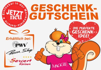Die Geschenk-Gutscheine gibt es im Wert von 10, 20 und 50 Euro. Eine Bearbeitungsgebühr oder andere zusätzliche Kosten werden übrigens nicht verlangt. An zwei Verkaufsstellen in der Marienplatz-Galerie können die Wertkarten erworben werden: gleich im Erdgeschoss im Presse-Shop sowie in der ersten Etage bei „Sewert Reisen“.