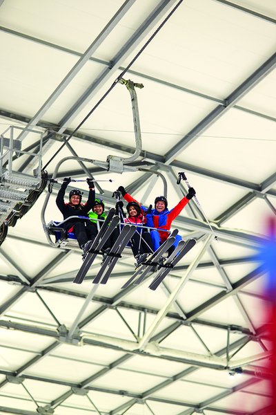 Europas größte Indoor-Skikalle bietet für jeden die passende Piste - und das bei erstklassigen Schneeverhältnissen. Blaue, leicht fahrbare sind es für Anfänger; rote für passionierte Skifahrer, die Freude an einem Gefälle von aufregenden 31 Prozent haben. 330 Meter lang und 50 Meter breit ist die Bahn, dazu kommen ein spezieller Übungshang für Anfänger und Kinder sowie eine 60 Meter lange Bahn, auf der es auf großen Reifen bergab geht. Und egal, wer wo starten möchte: 4er-Sessellifte und ein Anker-Schlepplift transportieren Gäste ganz komfortabel zum Gipfel der Halle.