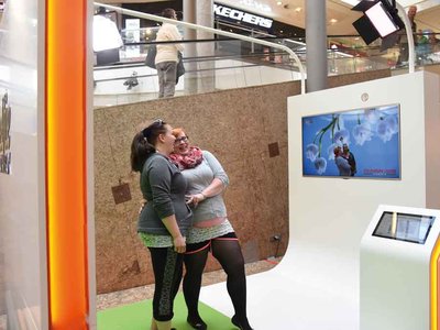 Dann nehmen die Selfie-Macher vor dem Green Screen Aufstellung – natürlich in entsprechender Pose, denn nur so sieht das Bild am Ende täuschend echt aus. Via E-Mail können sich die Models das Bild dann aufs Handy schicken lassen oder es in sozialen Netzwerken teilen.