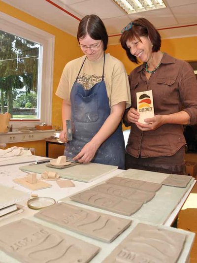 Und die bekommen eine ganz besondere Anerkennung für ihre Leistungen: handgefertigte Tontafeln anstelle von Medaillen. Hanna Janowski arbeitet in den Ramper Werkstätten des Diakoniewerkes Neues Ufer täglich daran, dass die edlen Stücke rechtzeitig zur ersten Siegerehrung fertig sind. Die junge Frau hat dafür mit weiteren Mitarbeitern sowie Gruppenleiterin Angelika Kliesch und Martina Zinkowski, die ebenfalls dieses Projekt in der Kreativwerkstatt begleitet, den Ton sorgfältig vorbereitet. Vorsichtig klopft sie mit dem Hammer auf die Prägetafeln, damit Logo und Schriftzug der Meisterschaft beim ersten Brennvorgang in den Ton übertragen werden. Nach mehrfacher Lasur kommen die Tafeln ein weiteres Mal in den Ofen.