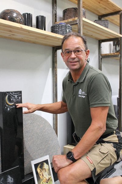 Die Herstellung von Grabmalen macht in der Werkstatt einen wichtigen Teil der Arbeiten aus. Mit Erleichterung beobachtet Uwe Lange, dass sich der Trend zu anonymen Bestattungen wieder abschwächt. „Wenn ein konkreter Ort fehlt, zu dem Menschen ihre Trauer tragen können, kann die innere Unruhe darüber auf Dauer zusetzen“, sagt er. Einen Wandel in der Bestattungskultur in Deutschland und Europa beobachtet Lange seit Jahren: „Er hängt damit zusammen, dass immer mehr Menschen von der Friedhofsarbeit ‘entpflichtet‘ werden wollen“ sagt er. Der Fachmann sieht es als seine Aufgabe, hier Angebote zu machen – die vor zwei Jahren von ihm initierten „Bestattungsgärten“ sind eines davon.