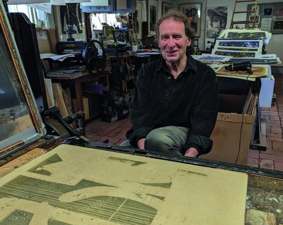 Gern zeigt Lutz Tesmar interessierten Menschen, wie seine händischen Druckpressen funktionieren. An Museumstagen und bei Veranstaltungen des Schleswig- Holstein Hauses ist der 70-jährige Tesmar ein gefragter Kenner der Druckkunst. Seit sieben Jahren sind seine Werkzeuge zur Herstellung von Grafiken durch unterschiedliche Techniken in der Remise untergebracht. Unter ihnen auch Schätze wie eine 150 Jahre alte Handpresse. Lutz Tesmar, in Berlin Mitte geboren, wuchs als Sohn eines Zimmermanns auf. Seit frühester Kindheit ist er vertraut im Umgang mit Holz, Steinen, Beton, Putz und allen Materialien, die man zum Werken und Bauen braucht. Vom Vater, Meister seines Faches, schaute er sich ab, wie man mit Werkzeugen, Maschinen, Farben und allerlei Tinkturen Werkstoffe bearbeitet. Nach Abitur und Ausbildung zum Zimmermann begann er mit dem Studium der Germanistik und Kunst an der Humboldt-Universität. Danach studierte er an der Kunsthochschule Weißensee und machte 1980, betreut durch seinen Lehrer Hans Vent, sein Diplom als Maler und Grafiker.