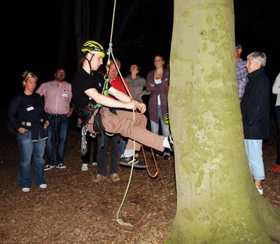 Unter dem Motto „Wir lassen niemanden hängen!“ hatte die IHK zu Schwerin zu ihrem jährlichen Treffen mit den regionalen Pressevertretern eingeladen. In abendlich-gelassener Atmosphäre ging es vom reichhaltigen Grill-Buffet direkt in die ausgelobten Team-Wettkämpfe. Dunkel war es bereits, als die Mutigen unter den Teilnehmern sich anschließend mit Stirnlampen ausgerüstet auf den Kletter-Parcour wagten – so war der Abgrund wenigstens nicht mehr ganz so deutlich zu sehen ...